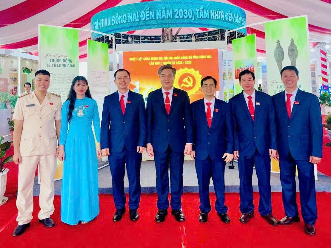 Các đại biểu tham dự Đại hội đại biểu Đảng bộ tỉnh Đồng Nai lần thứ I, nhiệm kỳ 2025 - 2030, tham quan và chụp hình lưu niệm tại triển lãm