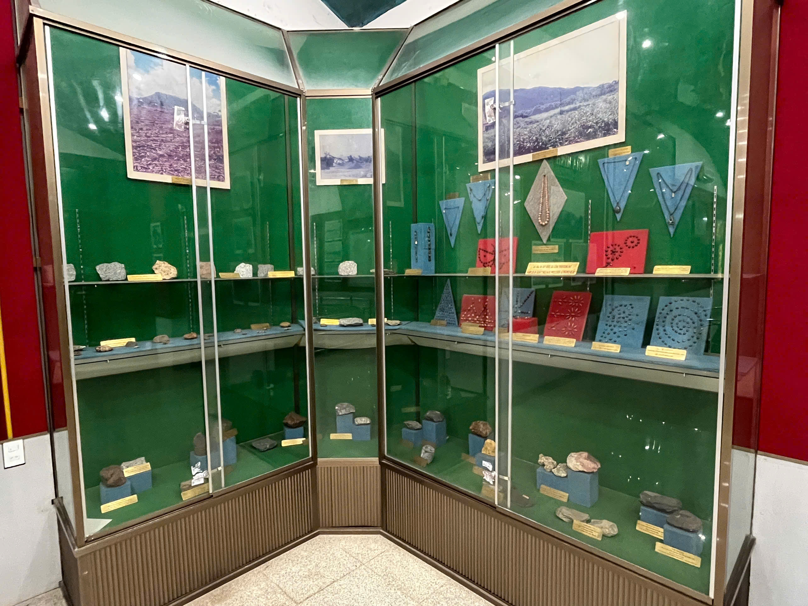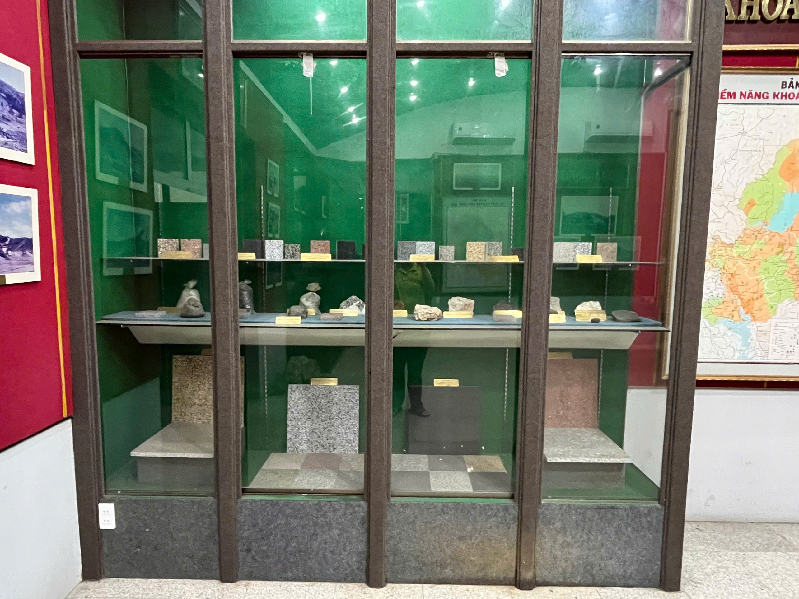 Hai tủ kính trưng bày các mẫu vật khoáng sản của tỉnh Đồng Nai.