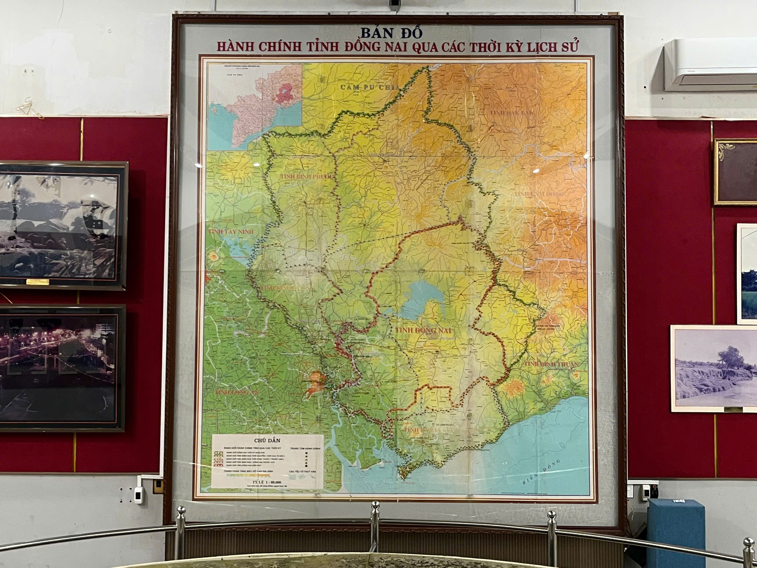 Phía sau sa bàn là một bản đồ thể hiện địa giới hành chính tỉnh Đồng Nai qua các thời kỳ, từ lúc khai phá đến hiện tại đã trải qua 5 lần thay đổi diện tích tỉnh. Thời kỳ mới lập tỉnh, diện tích trên 18.000km2 (đường viền màu xanh lá), hiện tại diện tích tỉnh chỉ còn 5.907 km2 (đường viền màu đỏ); dân số của tỉnh hiện nay khoảng 3,3 triệu người.